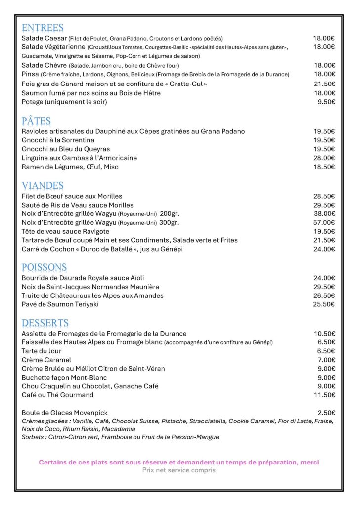 Le restaurant vous propose des plats variés en fonction des saisons, ainsi que les suggestions du moment terre et mer .
